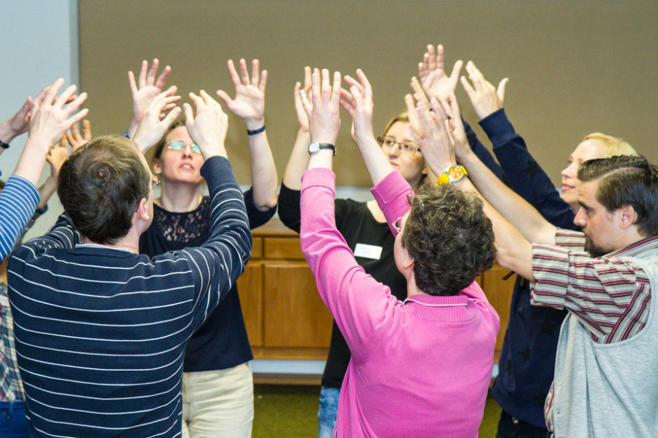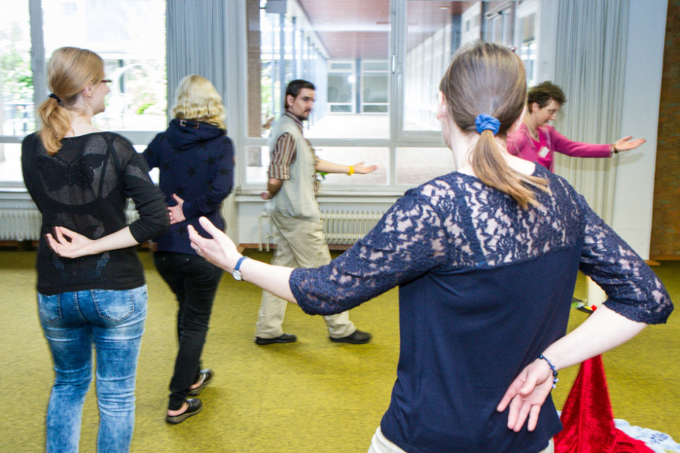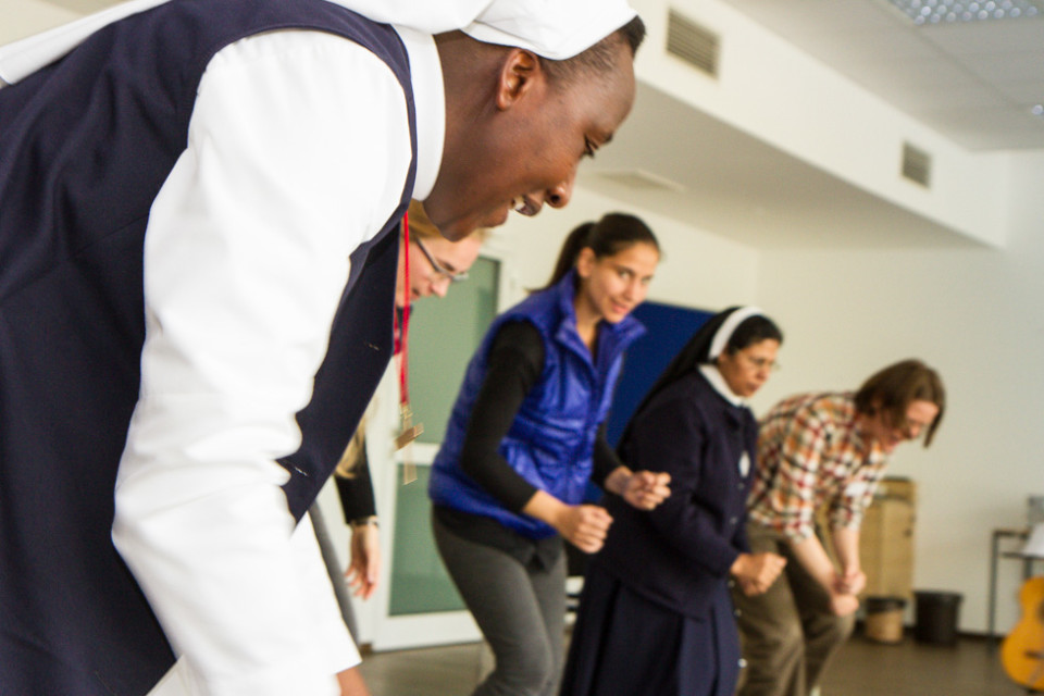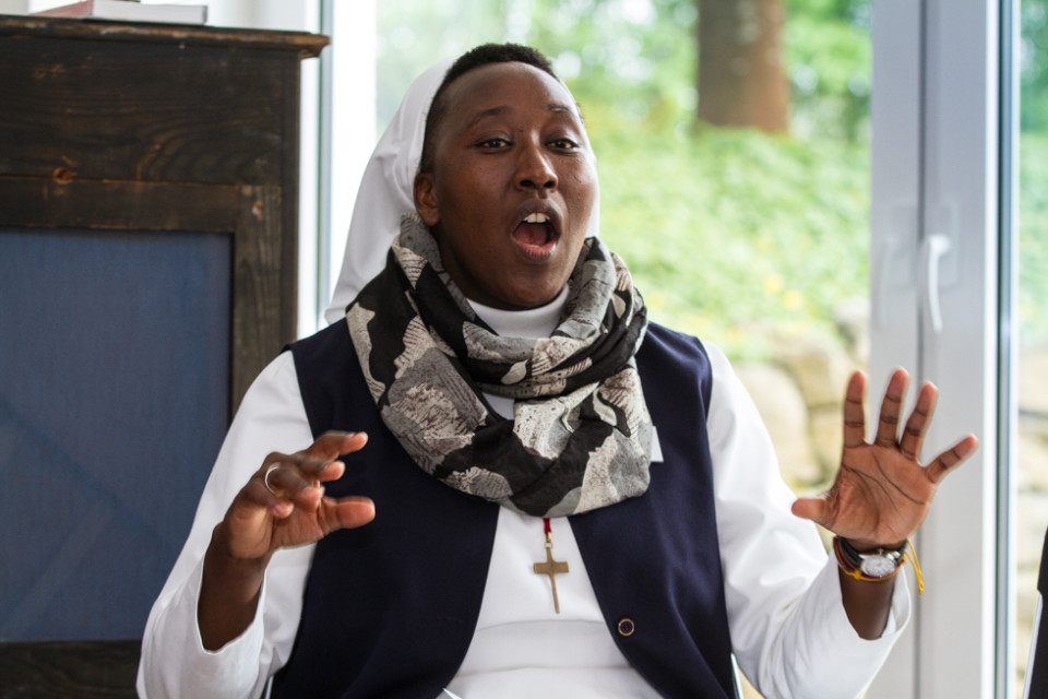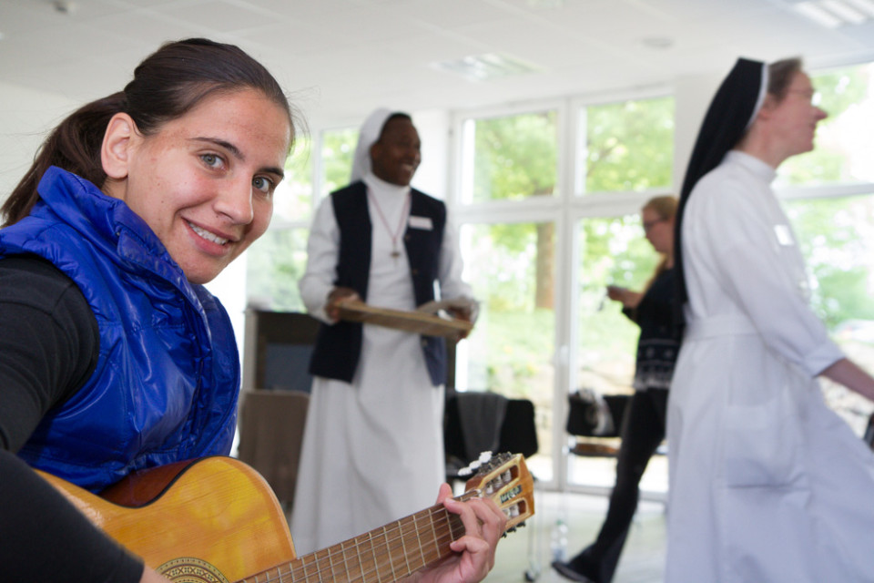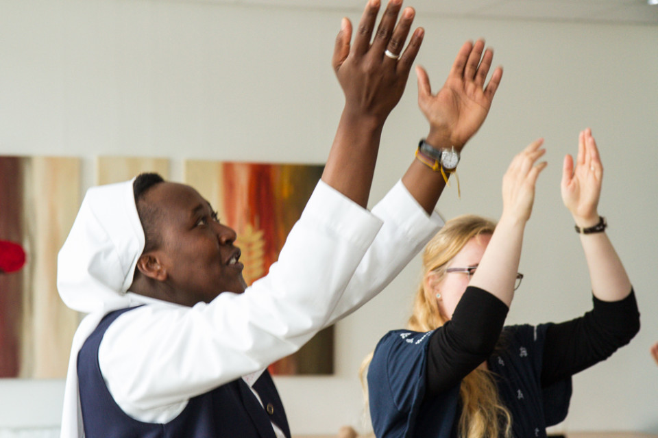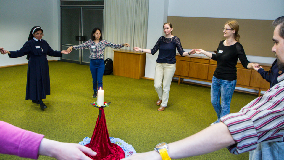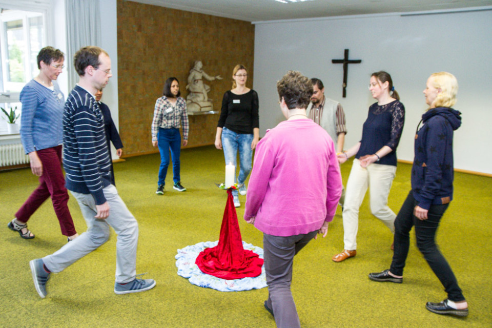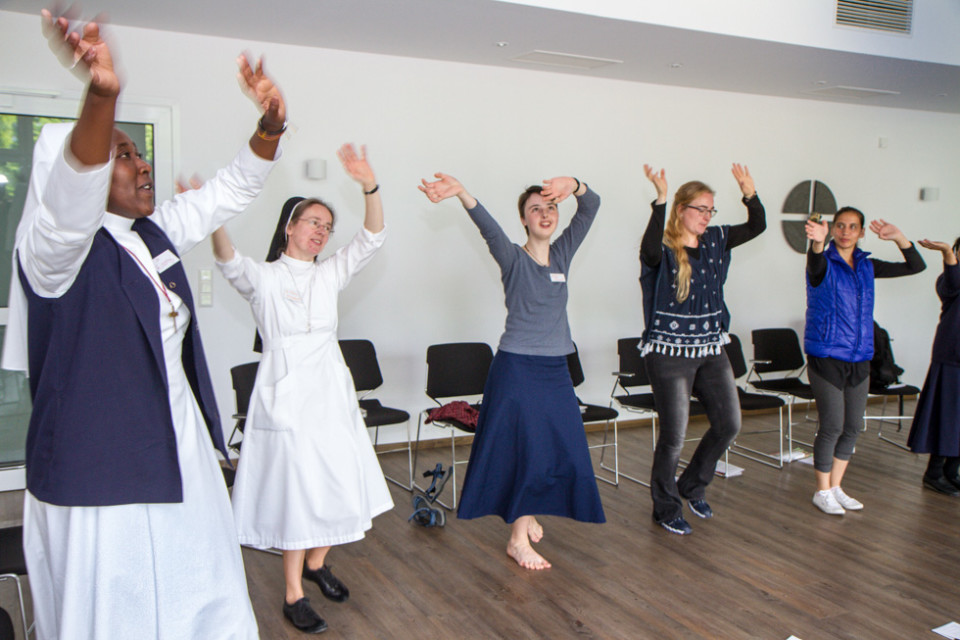 Die Gruppen des Pfingsttreffens setzen sich aber nicht nur in Gesprächen mit dem Thema Menschenwürde auseinander, sondern auch musikalisch und tänzerisch. Schwester Kitonyi Jasinta lud zum Trommeln, Musizieren und Singen ein. Und Annette Görner übte mit den Teilnehmerinnen und Teilnehmern in ihrer Gruppe meditative Tänze.
