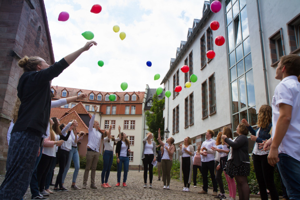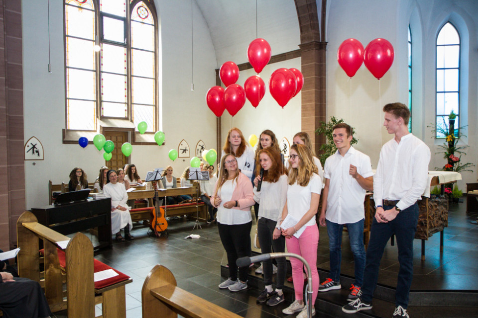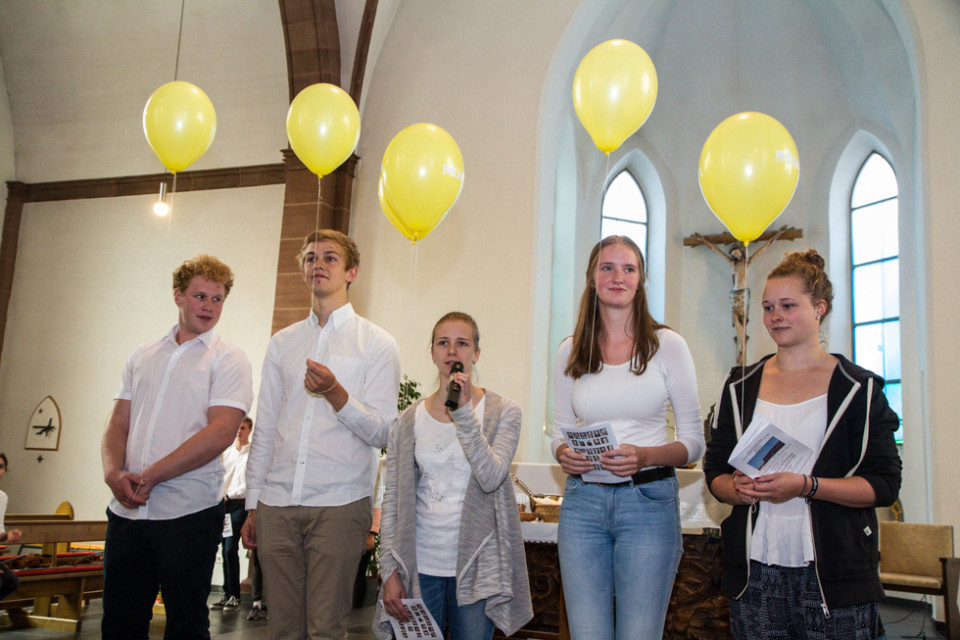 Den Gottesdienst stellten die jungen Erwachsenen, von denen die meisten gerade das Abitur gemacht haben, unter das Motto einer Ballonfahrt. Sie zogen mit Luftballons in vier verschiedenen Farben, die für die Entsendungsländer standen, in die Kirche ein und ließen sie nach dem Gottesdienst vor dem Bergkloster steigen.