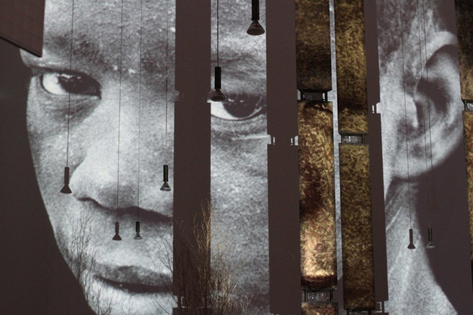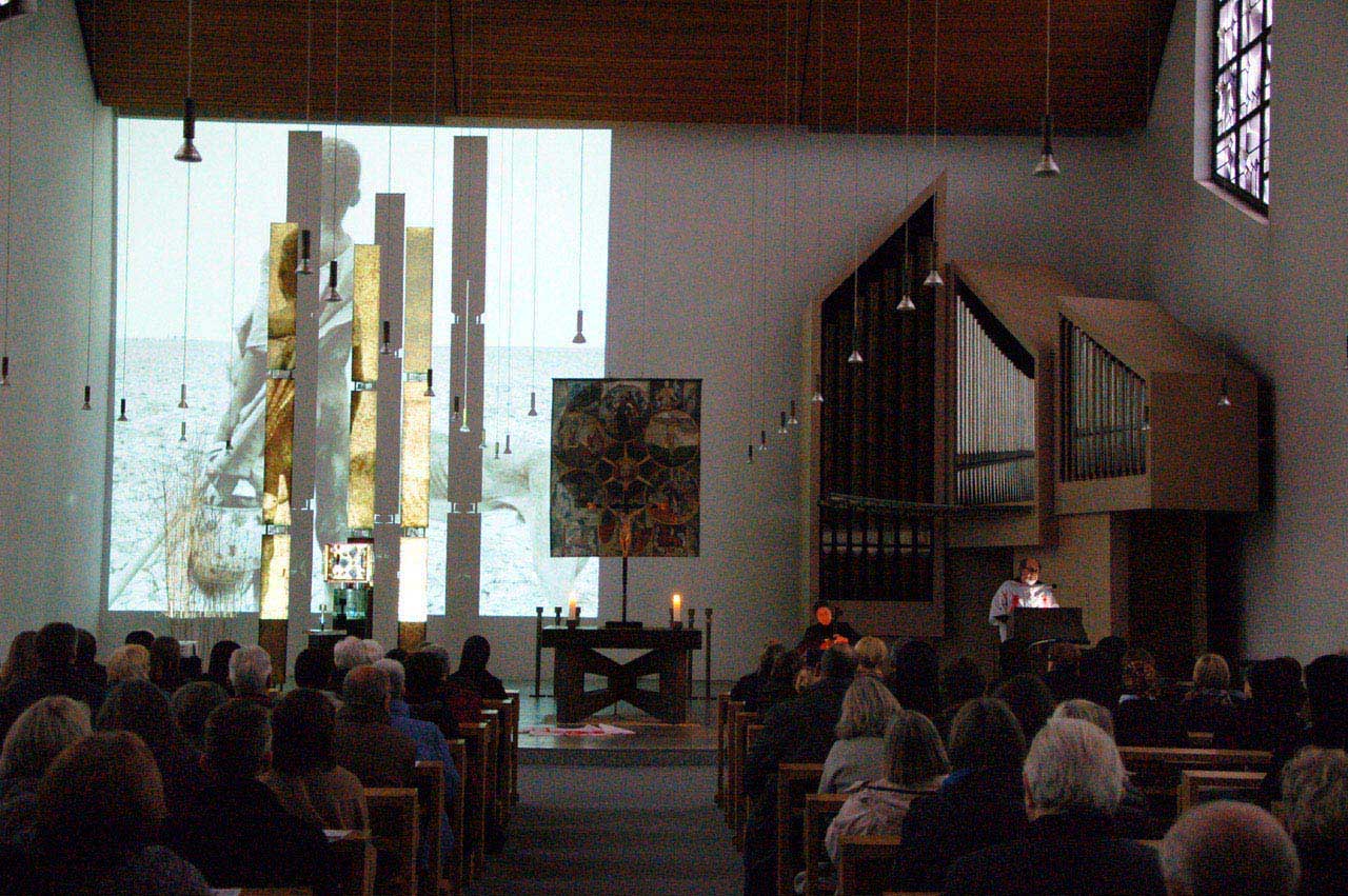 Überdimensionale Projektionen von Zeichnungen Ludger Hinses und Fotos aus den aktuellen Krisenregionen der Welt füllten den Altarraum. Dabei durchbrachen die drei hohen Stelen um den Tabernakel die Bilder auf beeindruckende Weise. Manchmal erschien auf Ihnen ein Auge, dann der Lauf einer Pistole.