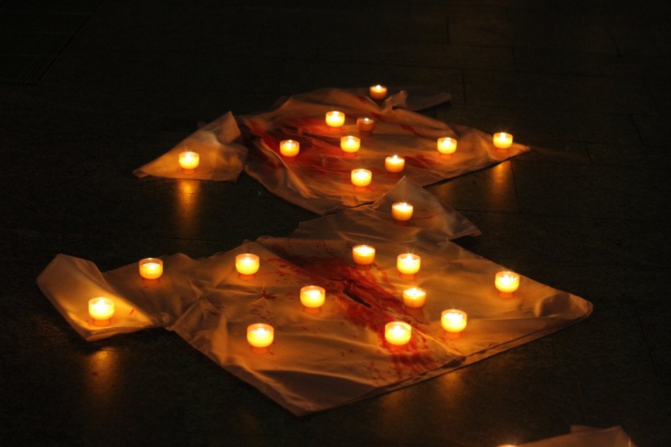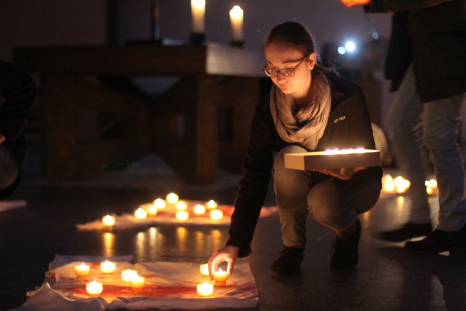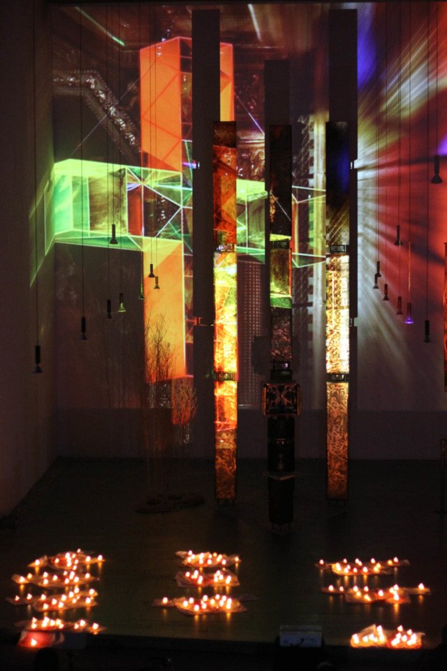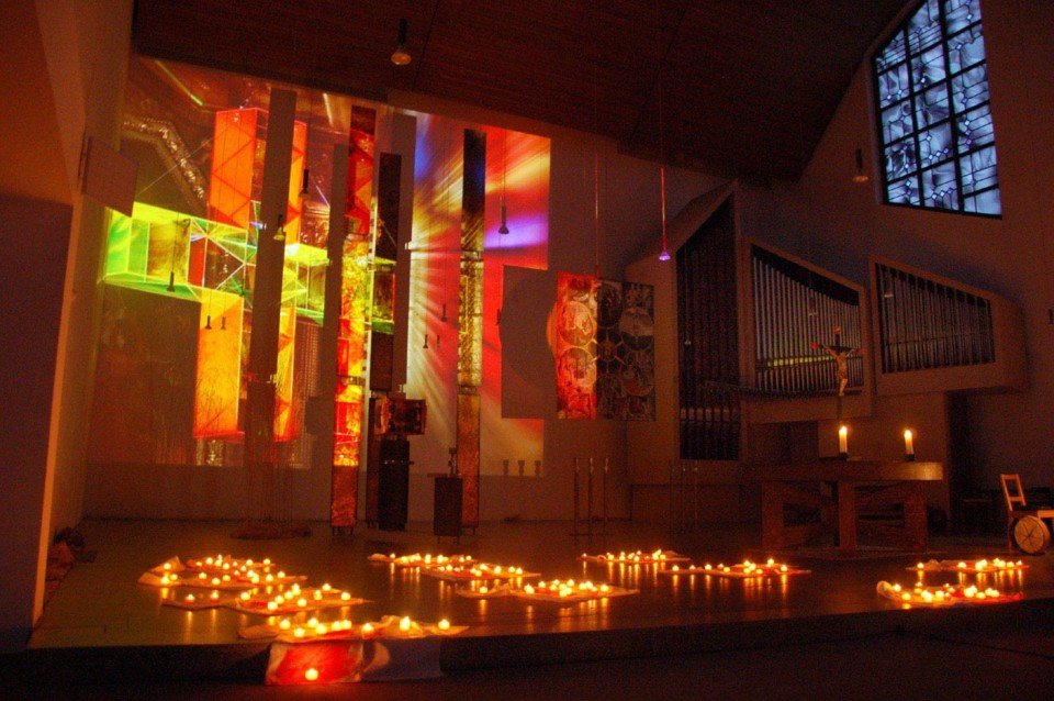 Am Ende des Abends stand jedoch wie eine Vorahnung auf Ostern die Hoffnung – als die rund 250 Besucher Kerzen auf die 13 im Altarraum ausgelegten Bluthemden stellten. Ein Lichtermeer breitete sich aus. Dazu erschein im Hintergrund ein Lichtkreuz von Ludger Hinse, das er „Himmelsleiter“ nennt.