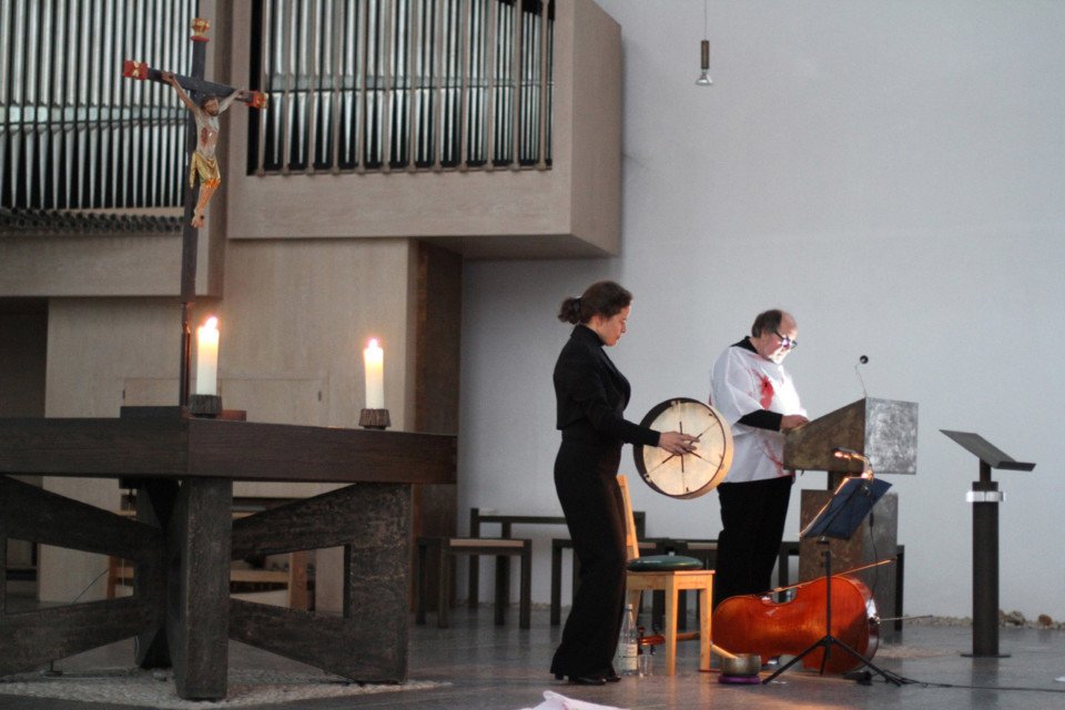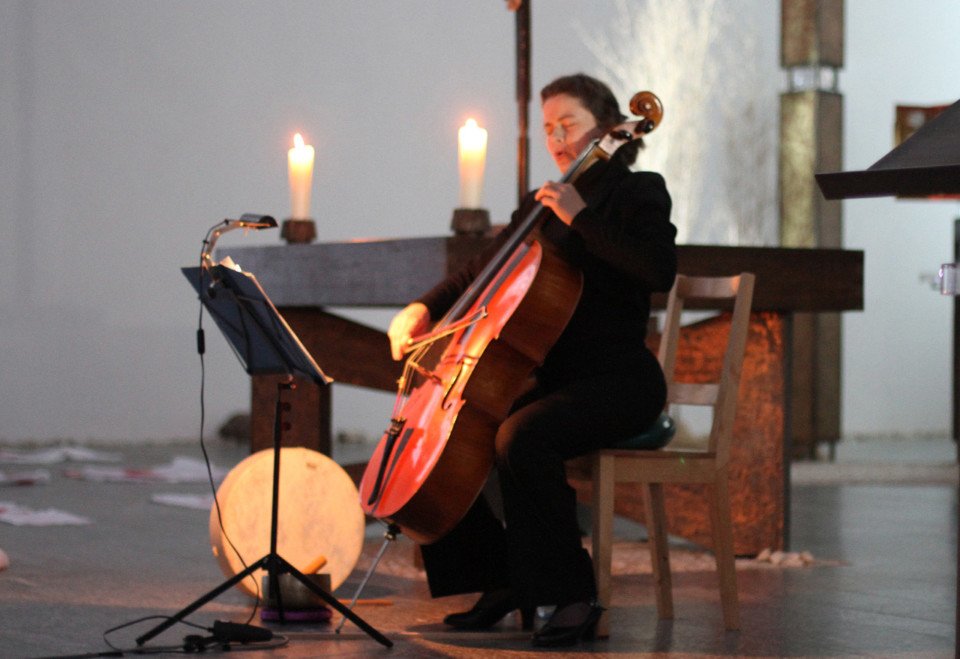 Barbara Marreck begleitete Hinse am Cello, an der Trommel und an der Klangschale. In ihrem Gesang kamen Trauer, Leid und Verzweiflung zum Ausdruck. Und mit ihrem Text „Wach bleiben“ appellierte sie, bei allem Leid in der Welt nicht wegzusehen, sondern hinzuschauen.