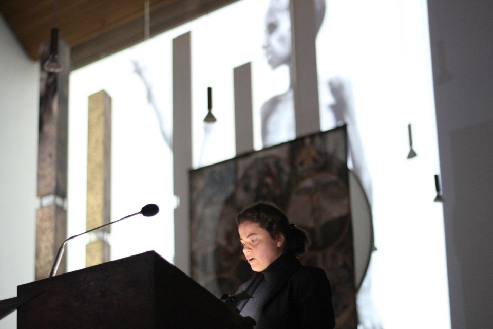 Dazu las Ludger Hinse aus dem Evangelium und rezitierte Texte, die die Qualen der Häftlinge im KZ oder der Kinder im Krieg thematisierten. Gedichte und Gedanken von Ernesto Cardenal, Reinhard Mey, Hildegard Nies und vom Künstler selbst schlugen die Brücke von Jesu Tod am Kreuz zum heutigen Leiden in der Welt. Dabei erinnerte Ludger Hinse daran, dass Gottes Sohn nicht zu den Reichen und Mächtigen kam, sondern „auf Schleichwegen“ zu den Menschen im Abseits fand.